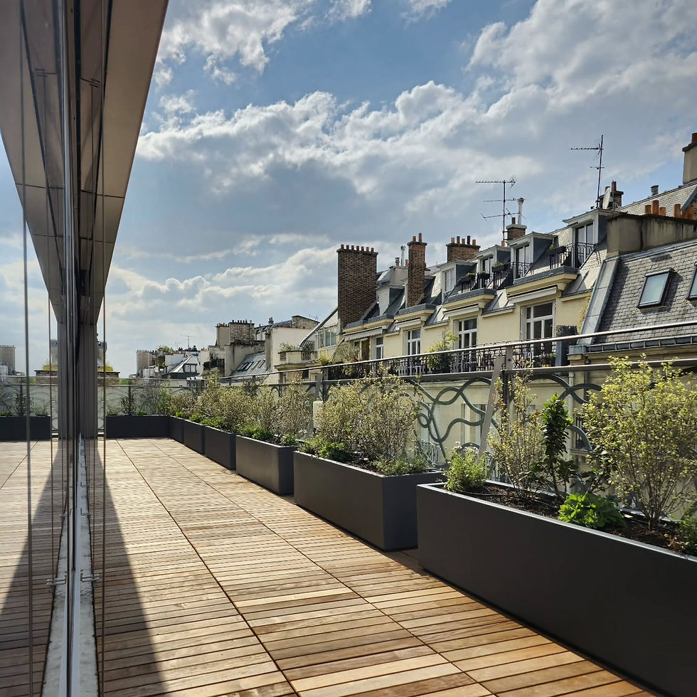Le défi : Métamorphoser un espace de stationnement en une terrasse paysagère pour les collaborateurs, où la nature reprend ses droits.